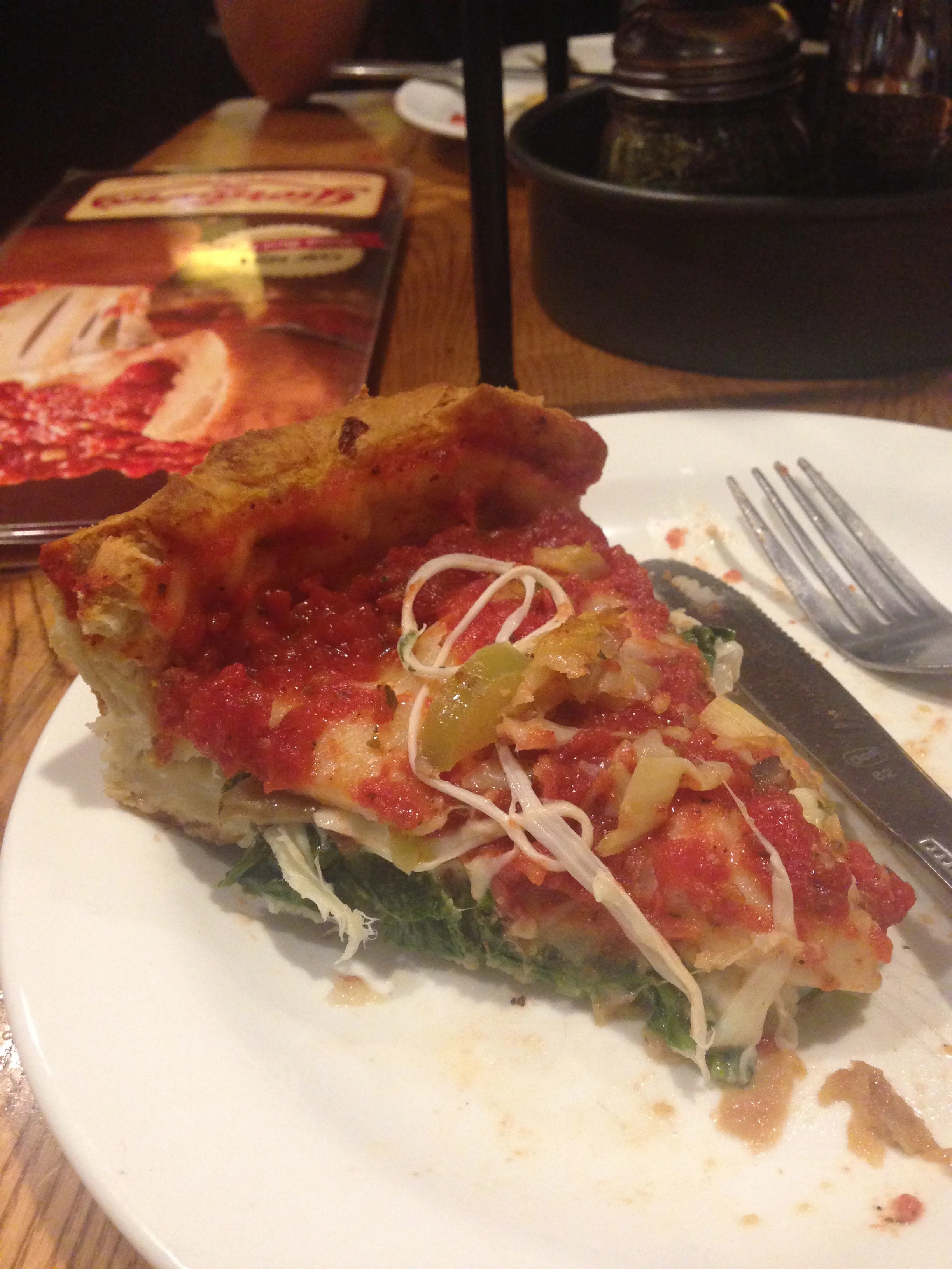 Julia and I agreed that deep dish pizza feels less like pizza and more like a casserole or a pie (Pizza will forever be a thin crust!!) but it was a good meal. We had some leftover and had it for breakfast another day, and we both agreed, it almost tastes better reheated than when we first got it.