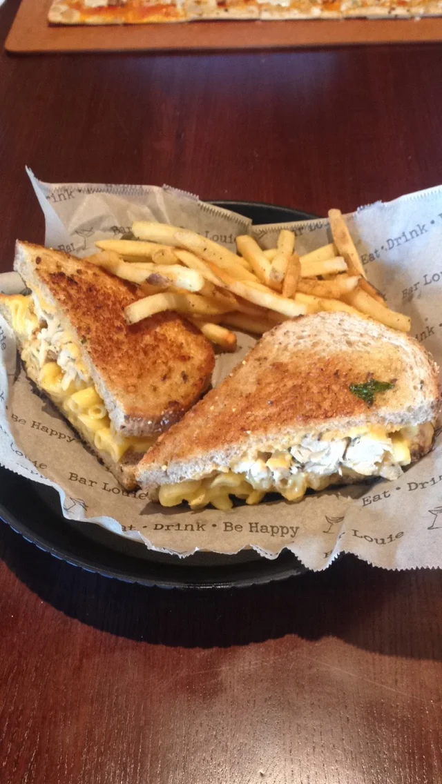 Jeff has been before but I have not, and I believe the last time he went he sent me this wonderful picture of a grilled mac and cheese sandwich. I had to try it. So this fine Wednesday, we met at bar Louie for lunch. Now this place is, of course, a bar and therefore it was pretty quiet during lunch but that was fine with me! We were seated right away close to a party of 7 elderly women (walkers and canes included) so of course, I knew it was going to be a good time. Our waitress was super relaxed and fun, she gave us a little rundown of the menu, and we ordered.