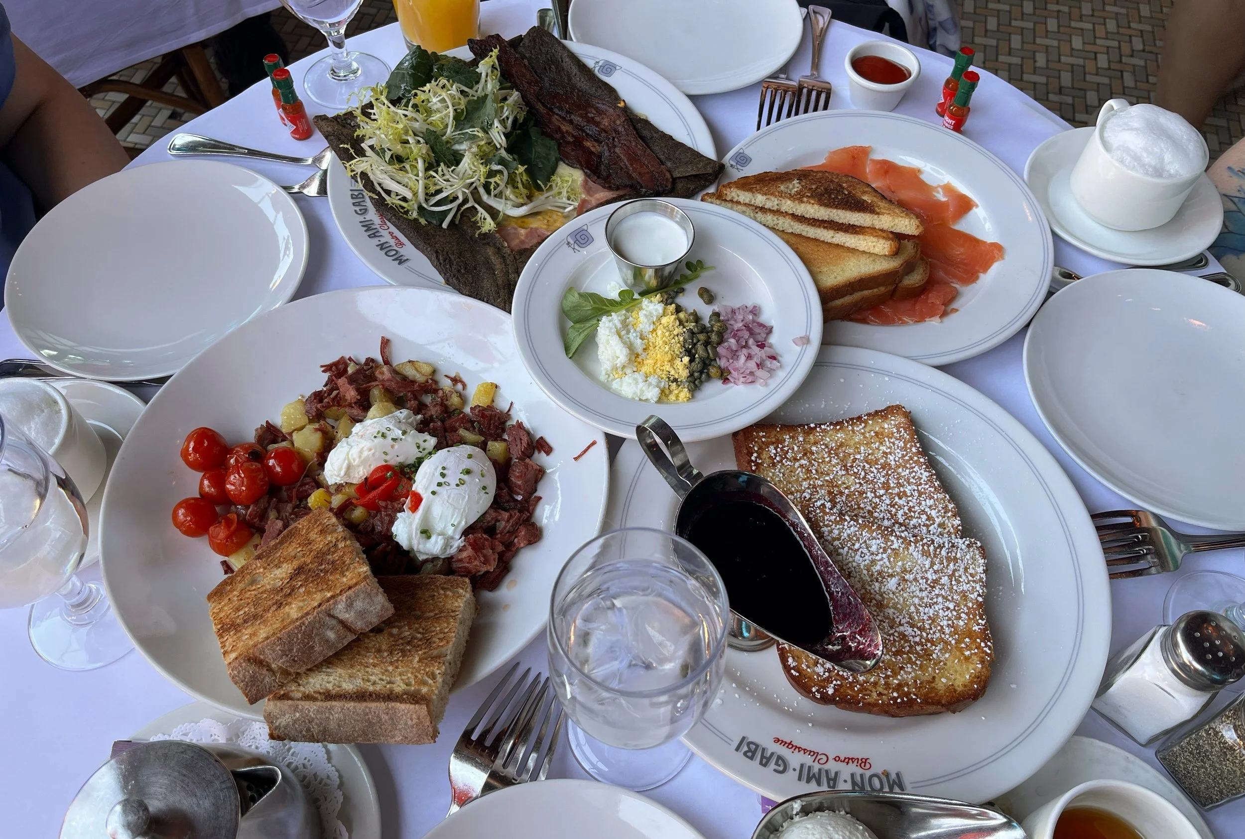 We’re kind of going family style today! (My pick) Ham & Cheese Buckwheat Crêpe (with eggs and date-glazed bacon), Smoked Salmon Platter (with toasted brioche, crème fraîche, capers, chive, and egg), Corned Beef Hash (with pached eggs, roasted peppers/tomatoes, and yukon gold potatoes), and French Toast (with blueberry syrup and whipped cream) all hit the table at once! These plates were a hearty amount of food and the restaurant was super cute. We got a really nice seat on an open patio though the tables were jam packed together so it was a little trick to maneuver around.