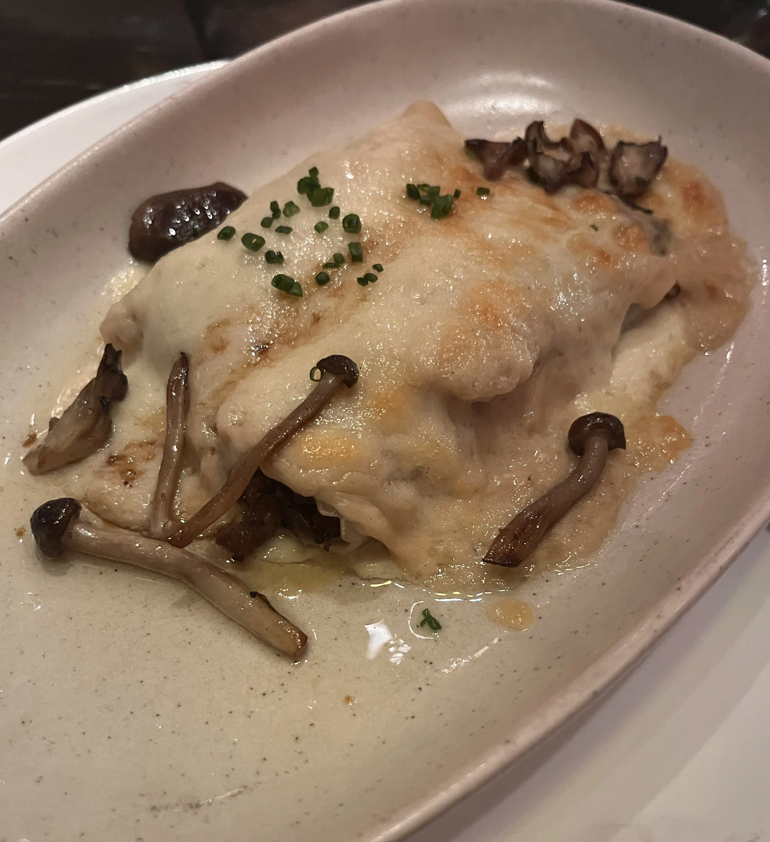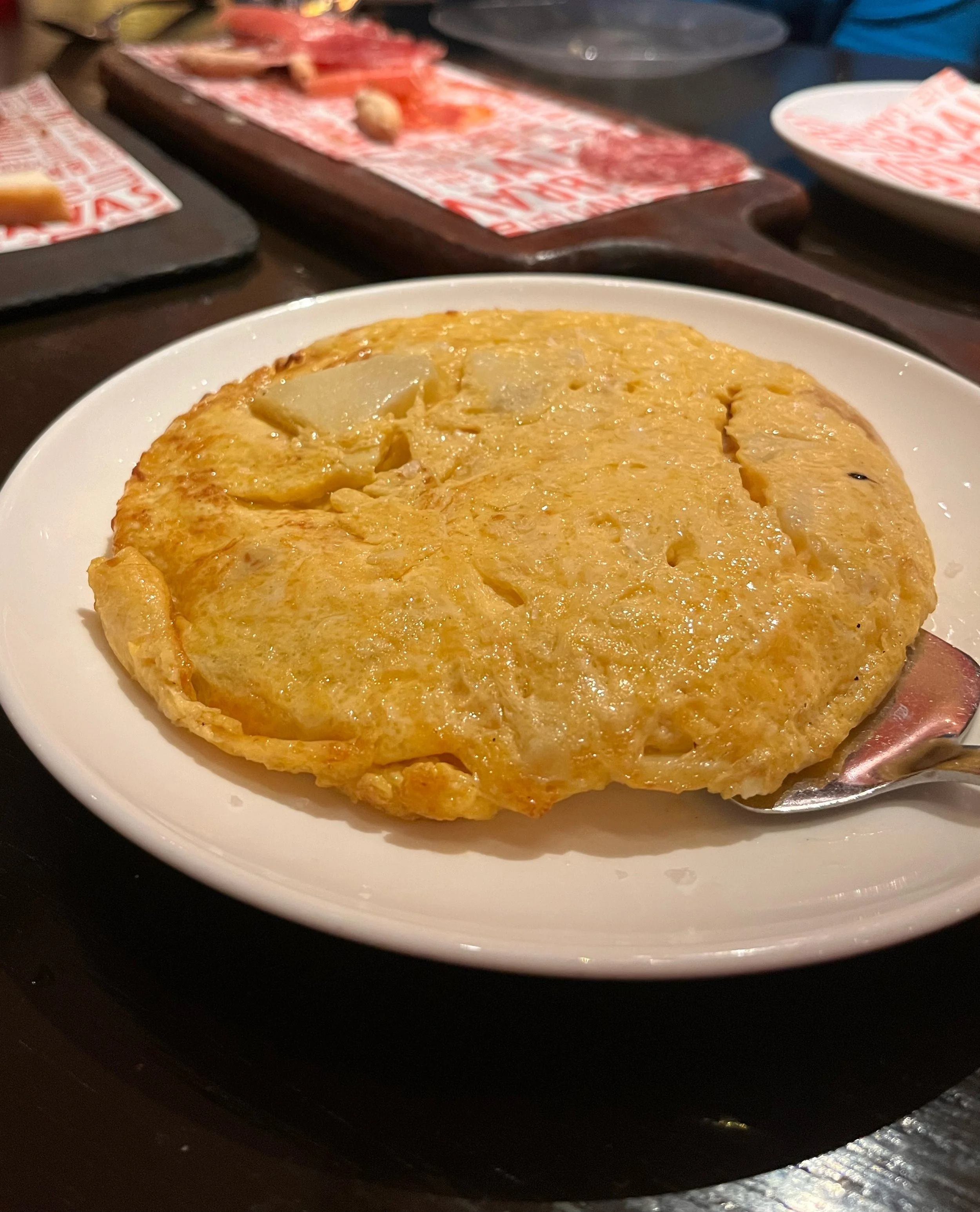 Tortilla de patatas clàsica (The classic Spanish omelet with potatoes and onions) - Honestly a little mid. It felt a little oily and compared to all our other dishes, this one was super mild in flavor with the egg and potato being more neutral. A little sad that I hyped it up in my mind, not sure I would recommend :(